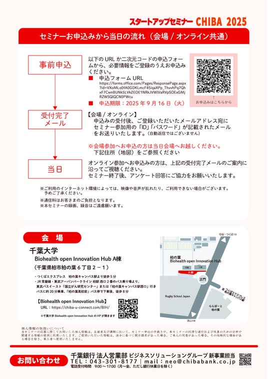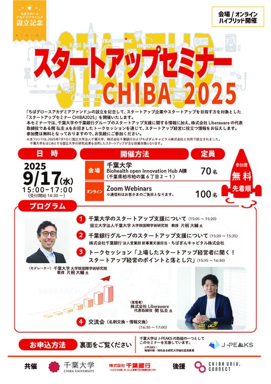 国立大学法人千葉大学(学長 横手 幸太郎、以下千葉大学)は株式会社千葉銀行(頭取 米本 努、以下千葉銀行)と共に2025年9月17日(水)に、地域のスタートアップを対象とした「スタートアップセミナーCHIBA 2025」を開催します。本セミナーは「ちばグロースアカデミアファンド」の設立を記念し開催されます。