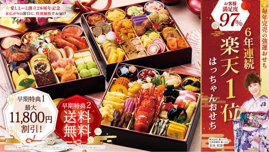 お客様満足度97%(注1.)を達成し、毎年完売する「はっちゃんおせち」は、今年も8月1日の発売以来、早くも楽天ランキング和洋中おせちセット部門でウイークリーランキング1位を獲得、これで6年連続の1位(注2.)獲得を達成いたしました。