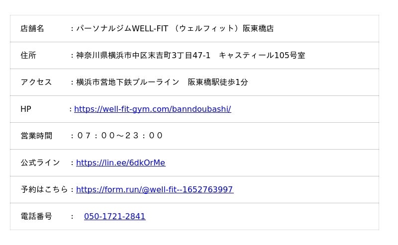 HPはこちら→https://well-fit-gym.com/banndoubashi/