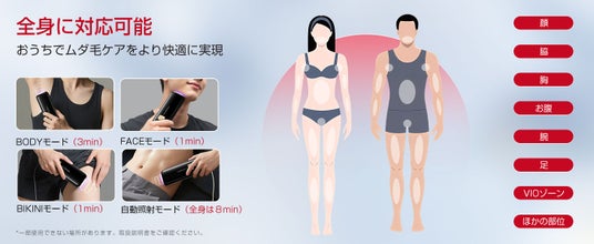 広照射面と自動連続照射により、全身のムダ毛ケアが短時間で完了。耐久回数は150万発で長く使用可能。