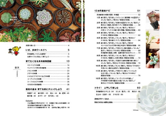 多肉植物の選び方から、植え替え・水やり・ふやし方など、基本のすべてを紹介。全87種類、見ると育てたくなる多肉植物図鑑も必見。