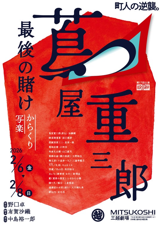 野口卓原作『蔦屋重三郎最後の賭け~からくり写楽』が、東京日本橋三越劇場で舞台化される。脚本・プロデューサーは、日本橋大伝馬町在住の有賀沙織(KASSAY)、演出は中島裕一郎(劇団民藝)。今年、NHK大河「べらぼう~蔦重栄華乃夢噺~」で蔦重が注目されているが、本作は晩年の蔦重を描く。主演は劇団俳優座の加藤頼、そして辰巳琢郎はじめ実力派俳優が集う。2026年2月6日15時~、7日13時~、17時~、8日11時半~、15時半~の全5回、東京日本橋の三越劇場にてKASSAYの主催で上演される。