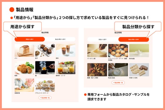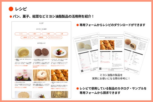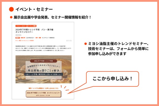これまで展開していた2つの食品業界向けサイトを集約化することで、本サイトで、食品開発に役立つトレンド情報や、マーガリン類、ショートニング、粉末油脂といったミヨシ油脂製品の情報を一括で提供できるようにしました。また、製品ごとの用途事例やレシピ、ミヨシ油脂独自の調査データ、食品に関する基礎知識、展示会出展やセミナー開催といったイベント情報も掲載しています。