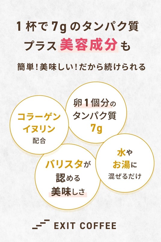 マッスルデリなどを運営する株式会社YOUR MEAL(本社:東京都港区、代表取締役社長CEO:須藤大輔、以下「ユアミール」)は、1杯でタンパク質が7gとれる「EXIT COFFEE(イグジットコーヒー)」を、新パッケージにて8月20日(水)より全国のロフト一部店舗にて順次発売を開始します。