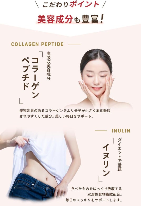 身体に吸収されやすい美容成分であるコラーゲンペプチド、食べたものをゆっくり吸収する食物繊維のイヌリンを配合。豊富な栄養成分で毎日のスッキリをサポートします。