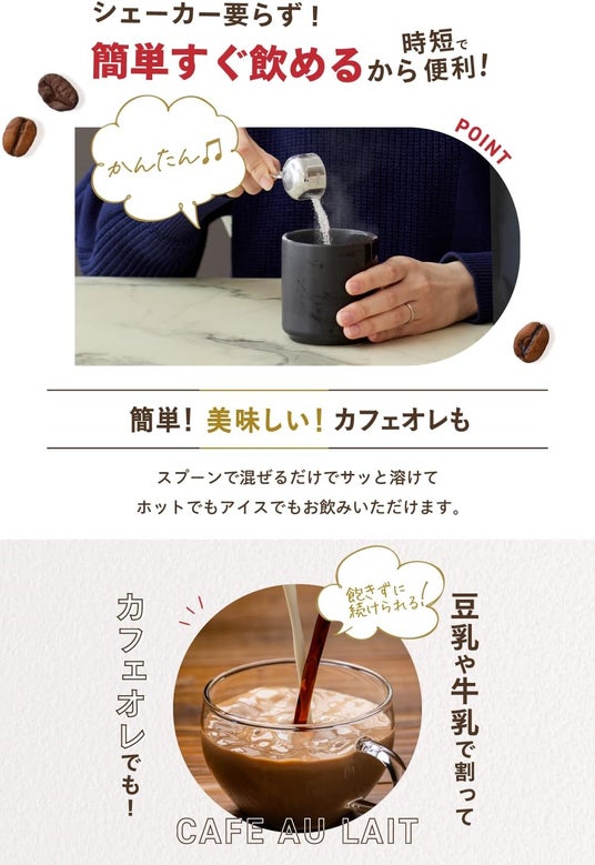 お湯や水にさっと溶かすだけですぐ飲める粉末タイプ。普段のコーヒーに置き換えるだけで手軽にタンパク質がとれます。