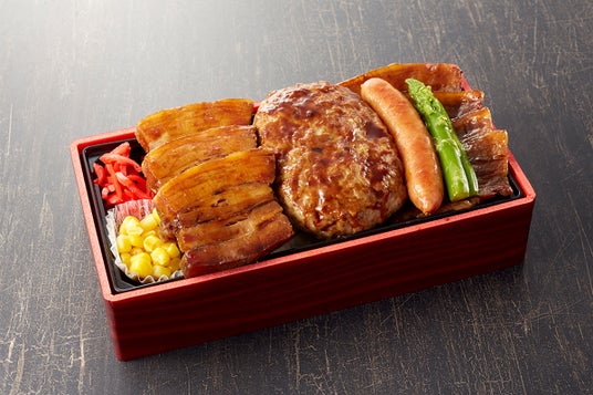 香ばしく網焼きされた十勝豚にジューシーなハンバーグ、トロトロに煮込まれた角煮を盛り付けた、大満足の一折です。