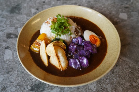 今金男しゃくをはじめ、旬の焼き野菜をトッピングした麻辣スープカリー。今金男しゃくの甘さ、ホクホク感と麻辣のピリッとした辛さのコンビネーションがクセになる一皿です。
