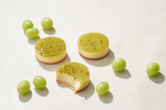 香ばしいアーモンドサブレに爽やかな酸味のベイクドチーズケーキ、瑞々しいシャインマスカットの果肉入りのジュレを重ねた「小樽洋菓子舗ルタオ」の人気スイーツ。ベイクドチーズケーキは北海道産生クリームを使用しています。