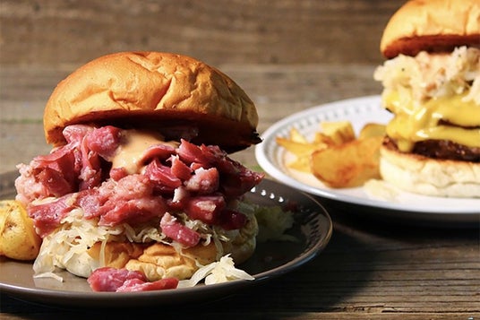 国産の豚すね肉を数種類のスパイスと香味野菜で煮込んだ、「ESSEN SAPPORO」の名物肉料理「アイスバイン」を贅沢に挟み込んだバーガーが登場します。