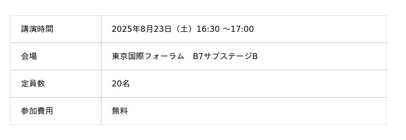 2025年8月23日(土)16:30よりソラナリゾート株式会社 萩原 麻貴 氏 が会場限定セミナーに登壇。東京国際フォーラムB7サブステージB会場