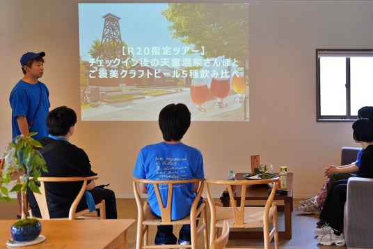 天童温泉トラベラーズラウンジでのツアー出発前のブリーフィングの様子