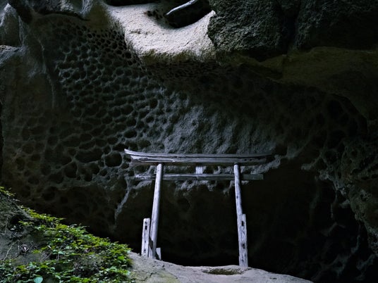 垂水遺跡にある奇岩と鳥居の神秘的なスポット