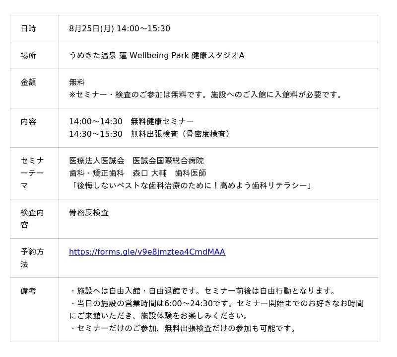 「うめきた温泉 蓮 Wellbeing Park」(総支配人:藤立 達哉、所在地:大阪市)は、2025年8月25日に、提携医療機関である医療法人医誠会(代表者:谷 幸治、本社:大阪市)の「医誠会国際総合病院」の医師を講師に招き、第4回健康セミナーを開催することをお知らせします。