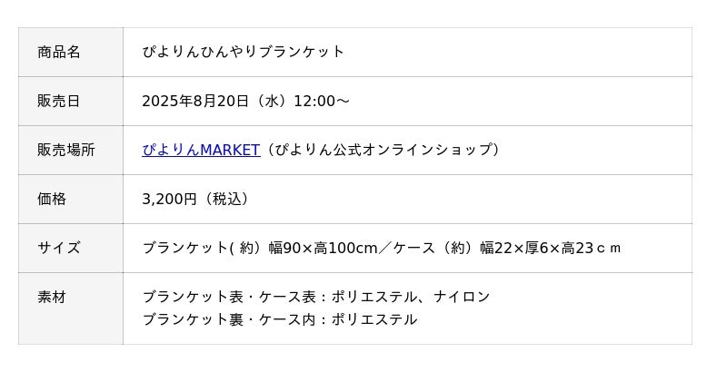 ジェイアール東海フードサービス株式会社(本社:愛知県名古屋市、代表取締役社長:岩下賢一)は、大人気オリジナルスイーツ「ぴよりん」をモチーフにした新作グッズ「ぴよりんひんやりブランケット」を、2025年8月20日(水)より、ぴよりん公式オンラインショップ「ぴよりんMARKET」で販売開始いたします。まだまだ厳しい残暑が続くこの季節にぴったりの、接触冷感生地を使用したポーチ一体型ブランケットです。