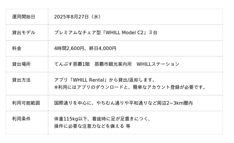一般社団法人 那覇市観光協会(所在:那覇市、会長:宮里一郎、以下「那覇市観光協会」)と沖縄トヨタ自動車株式会社(本社:沖縄県浦添市、代表取締役社長:野原朝昌、以下「沖縄トヨタ」)ならびにWHILL株式会社(本社:東京都品川区、代表取締役社長 CEO:杉江理、以下「WHILL社」)は、那覇市中心部の観光エリアのアクセシビリティを整備する一環として、免許もヘルメットも不要で歩行領域を走行する近距離モビリティWHILL(ウィル)を活用した移動サービスを2025年8月27日(水)より提供開始することを発表いたします。国内外から多くの観光客でにぎわう那覇国際通りを中心に、誰もが歩行領域を安心快適に散策できる環境を整えることで、往来する人々とも共生共存を図りながら、回遊利便性を高めるとともに、滞在時間の延伸や満足度向上を図ります。貸出ステーション(WHILL SPOT)は那覇市観光案内所に設置します。貸出には、非対面式の専用アプリを採用することで、管理者側の運用オペレーションの省力化と効率化も目指します。
