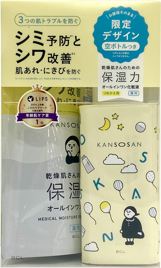 しっとり化粧液のつめかえに、デザインボトルとパッケージキャラクター「乾燥守子さん」非売品チャームが付いたセット。
