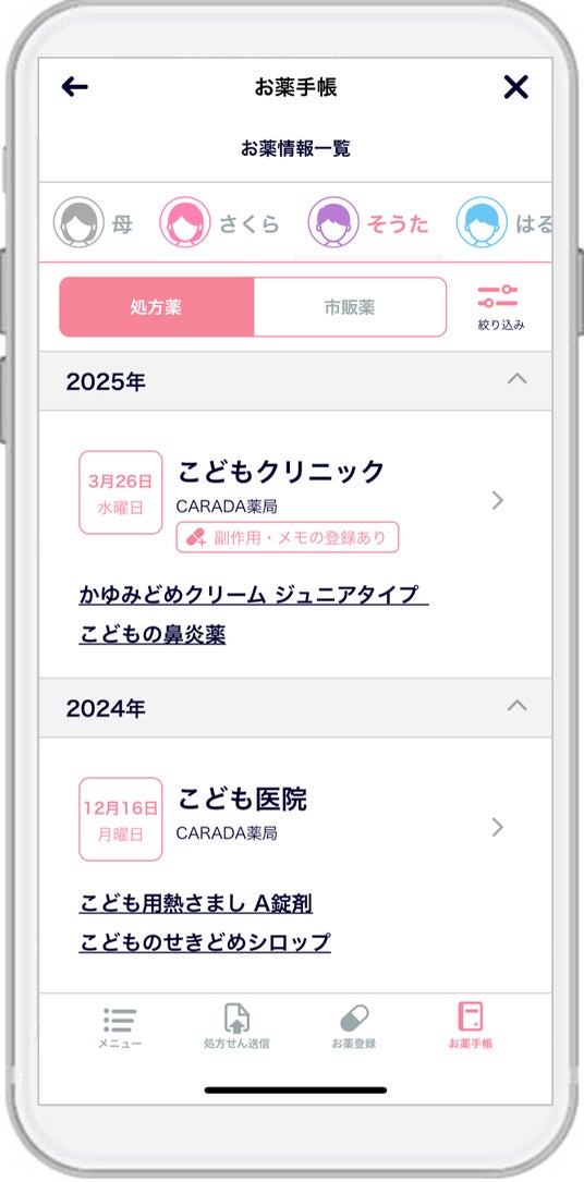 今回『ルナルナ』アプリから利用できるお薬手帳機能は、アプリ内の「受診タブ」から、お薬手帳ボタンをタップするだけでシームレスに利用できます。※4本機能にて、利用者や利用者の家族に処方された薬を個別に記録・管理でき、薬の記録は、調剤明細書のQRコードの読み取りや写真撮影によって簡単にできるため、手入力する手間が省けます。