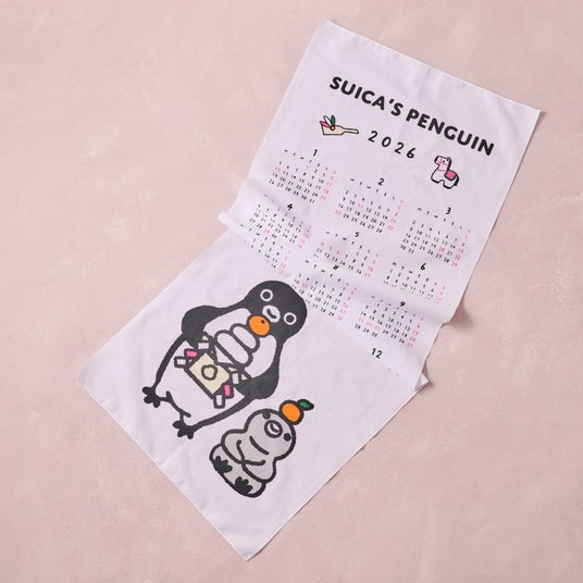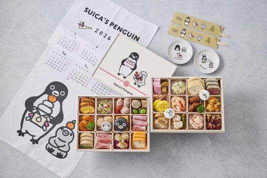 パールホワイトの華やかなお重は、オードブルを運んでくれている様子をイメージしたデザインになっています。祝箸と昨年好評だった豆皿の1枚には、干支の「うま」をデザインしました。大きなSuicaのペンギンたちのイラストが可愛らしい2026年のカレンダー柄の手ぬぐいは、お正月だけでなく1年を通して楽しめます!