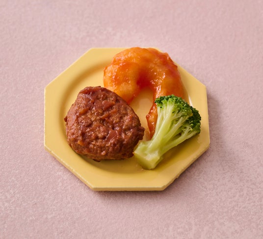デミグラスハンバーグ、海老チリソース、ブロッコリーコンソメ風味