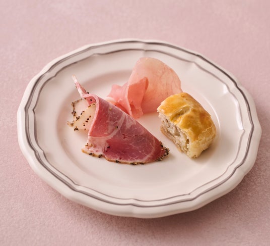 生ハム、アンデスポークパストラミ、鶏のポルチーニパイ包み
