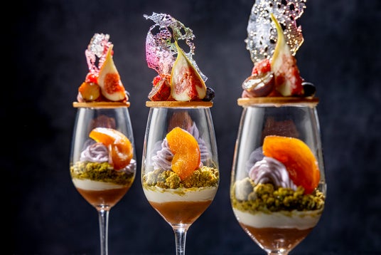 香ばしいアーモンドの風味が広がるマロンプラリネペーストをベースに、バニラビーンズ入りシャンティイと、宇治抹茶香るクランブルを重ねた、深みのある味わい。鮮やかな紫色のタロクリームとキャラメリゼしたリンゴが上品な甘みを添え、秋の趣を一層引き立てます。トップにはタロアイスクリームのクネル、フレッシュ無花果と栗をあしらい、まるでガラス細工のように繊細なイソマルトシュガーが華やぎを添える秋の主役にふさわしい優美なパフェです。