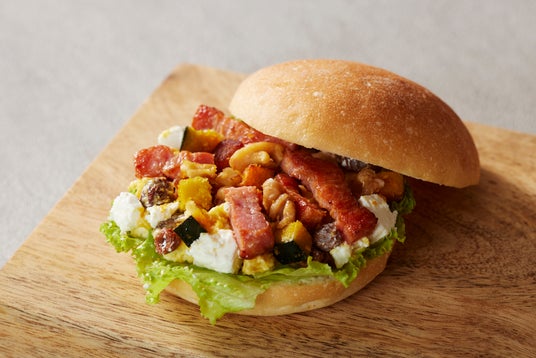 かぼちゃ、ベーコン、クリームチーズ、くるみ、レーズンなど、彩り豊かな具材をふんわりサンド。見た目も味わいも秋らしい、軽やかなバーガー。