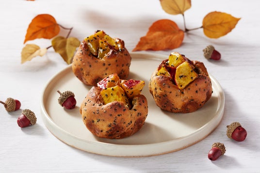 黒ごま香るブリオッシュに、蜜漬けさつまいもを合わせました。やさしい甘みが広がる、朝のカフェタイムにもおすすめのスイーツブレッド。