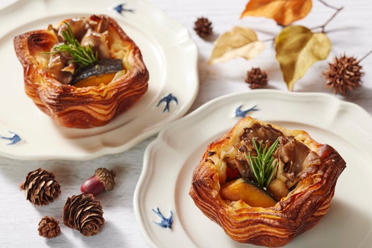 パリッとした食感が楽しいパイ生地に、香ばしいきのこと甘みのあるかぼちゃをたっぷりと詰めました。ローズマリーの風味がアクセントになった季節感あふれるセイボリーパイ。