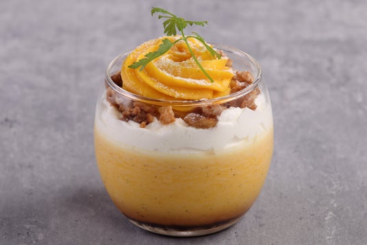 なめらかな食感のパンプキンプリンに生クリーム、クッキー、ナッツのキャラメリゼ、かぼちゃクリームをデコレーションしたグラスデザート。