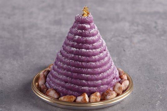 洋梨のムースの周りに紫芋のクリームを絞り、ナッツを散りばめたきれいな紫色のモンブラン。洋梨の濃厚な甘みと紫芋の素朴な甘さをお楽しみください。