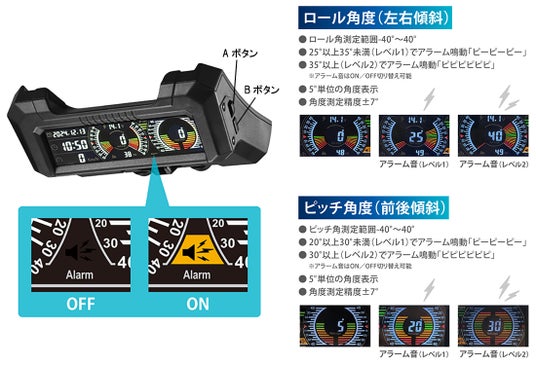 ロールやピッチの角度が一定の数値を超えるとアラーム音が鳴ります。
