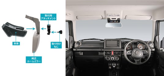 専用設計のアタッチメントを使用することで、純正ルームミラーの支柱を挟み込む形で簡単に取り付けることができます(特許出願済)。車内装や当社ジムニー専用製品と共通するモチーフをデザインに取り入れており、トータルコーディネートも可能となっています。