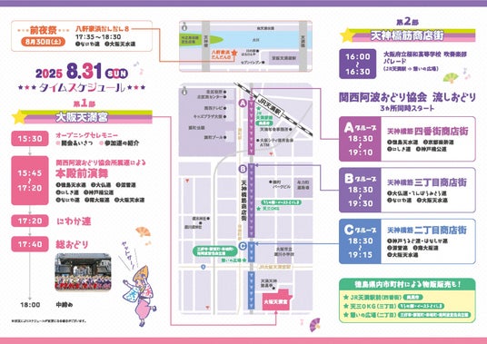 また、今年は前夜祭として8月30日(土)に京阪電鉄天満橋駅隣の「八軒家浜だんだん8」でも関西阿波おどり協会所属連による熱気あふれる阿波おどりが披露されます。
