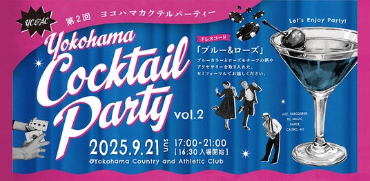 YC&AC YOKOHAMA COCKTAIL PARTY実行委員会(神奈川県横浜市/代表:株式会社エクラスト 坂本奈緒子)は、2025年9月21日(日)、Yokohama Country and Athletic Club(YC&AC)にて、「第2回YC&ACヨコハマカクテルパーティー」を開催いたします。ライブ、ダンス、マジック、フレアショー、カジノなど多彩なエンタメを楽しみながら、このパーティーのためにバーテンダーが創作した13種のオリジナルカクテルをご堪能いただけます。普段からバーとカクテルに馴染みが深い方だけでなく、初心者も心ときめくサプライズ満載な横浜の夜をご提案します。日本初のバーが誕生した横浜のバー&カクテル文化をショーアップさせた、遊び心あふれるカクテルパーティーをお楽しみください。