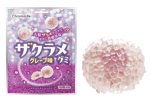 紫色代表は、もちもちとした食感のジュレ入りグミに大粒ザラメコーティングによる「ザクザク」とした食感が特長の「ザクラメグミ」からグレープフレーバーがお目見え。口に含むとグミならではの弾力はそのままに、ザクザク食感が心地よく広がります。最深層にはグレープ味のジュレが閉じ込められており、甘酸っぱい味わいが広がります。
