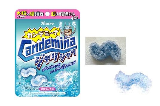 青色代表は、ユニークな形状でハードな食感が楽しめる「カンデミーナ」から誕生した、“ジャリシャリ”食感の新商品。爽快ラムネ味の小粒なハードグミをシリーズ最大の大粒パウダーでコーティングし、抜群の食べ応えを実現した小腹満たしに最適なグミです。