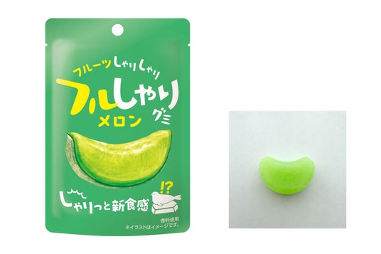 緑色代表は、“しゃりっ”とした新食感が魅力の「フルしゃりグミ」シリーズからメロンフレーバーが登場。厚めのシュガーコーティングが特長で、芳醇な香りと優しい甘さをギュッと閉じ込めています。まるで切ったメロンのような形です。