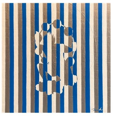 <現代アート:阿部高大>絵画 風神雷神図21972年生まれ。幼少期から絵に親しみ建築を志す。バウハウス思想に影響を受け建築デザイナーとして活動。2009年、國美芸術展で受賞。宇宙的視点と日本の美意識を融合し、定規を使わない直線・真円にこだわる独自の作風で創作を続けている。