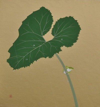 <日本画:磯部 光太郎>Biotop 葉っぱの傘日本画の技法で身近な自然や小さないのちを描く作家です。大きな葉陰に雨宿りするアマガエルを描いた団扇。金地の背景に映える鮮やかな緑と、葉に残る水滴の描写が、雨上がりの澄んだ空気と静けさを伝えます。自然の一瞬を丁寧に捉えた、涼やかな季節感あふれる一枚です。660,000円