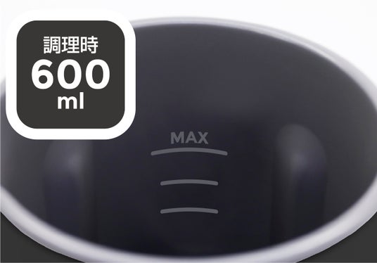 調理時の定格容量は600ml。2~3人分にぴったりなサイズ感で、スープやお粥をまとめて作ってストックしておくのにも最適です。