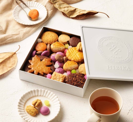 楓や栗をモチーフにしたクッキー、シナモンの香りが上品なサブレ、甘酸っぱいカシスのメレンゲ、キャラメルチョコをコーティングしたピーカンナッツなど、秋の味わいが広がるお菓子を詰め合わせたHIBIKAならではのクッキー缶です。