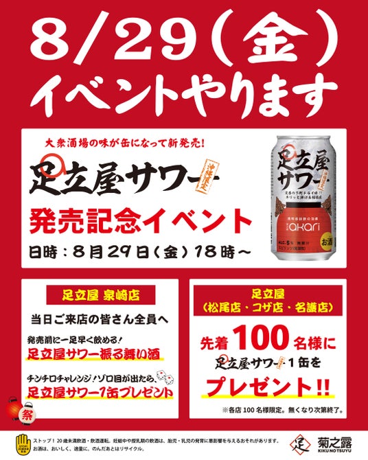 各店先着100名様に、足立屋サワー1本をプレゼント!