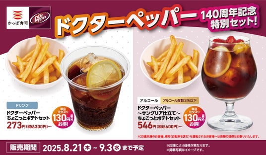 コロワイドグループのかっぱ寿司(カッパ・クリエイト(株) 本社:神奈川県横浜市、代表取締役社長:山角豪)は、2025年8月21日(木)~9月3日(水)にて、ドクターペッパー誕生140周年を記念し、ドクターペッパーと連動したドリンク『ドクターペッパー』『ドクターペッパー~サングリア仕立て~(アルコール度数3%以下)』『ドクターペッパー ディーゼル(アルコール度数3%以下)』をかっぱ寿司全店で販売いたします。また、同期間にて、ポテト付きでお得に楽しめる特別メニュー『ドクターペッパー140周年記念特別セット』全3種を販売いたします。