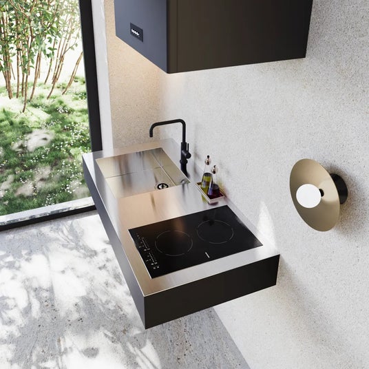 極限まで要素を減らしたミニマルカウンターキッチン「レヴロック」。 極薄の見付けのステンレスカウンターは、すっきりとしたシームレスデザインを実現。トレンドのカウンターキッチンを自分好みにアレンジすることで、あなただけのキッチン空間に。