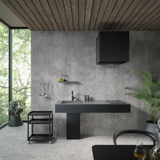 自然光とつながる、開放的なキッチン空間。生活感を抑えた無機質な素材とグリーンが交錯し、心地よい静けさを漂わせるモダンな空間に仕上がります。