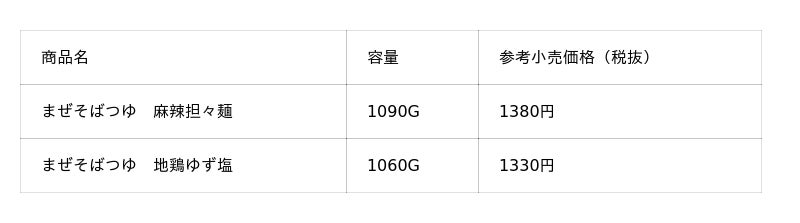~新商品『まぜそばつゆ麻辣担々麺』、『まぜそばつゆ地鶏ゆず塩』の2品が登場~