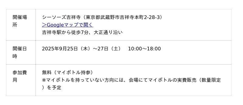 株式会社未来づくりカンパニー(本社:東京都港区、代表取締役:大羽昭仁)が、運営する日本茶専門Webサイト「Japan Tea Action」は、2025年9月25日(木)~27日(土)の3日間、東京・吉祥寺にて、日本茶の水出し体験イベント「マイボトルで楽しむ、私の日本茶づくり」を開催します。本イベントでは、参加者が持参したマイボトルに、好みの茶葉を自由に組み合わせて「マイお茶パック」を作り、その場で水出しして味わうことができます。日本茶インストラクターによるアドバイスもあり、初めての方でも安心して楽しめます。