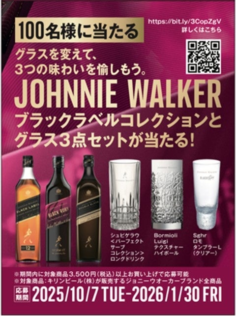 2025年10月7日(火)~2026年1月30日(金)の期間で対象の「ジョニーウォーカー」商品を3,500円(税込)以上購入した方を対象に、抽選で100名様に「ブラックラベル」コレクション3種とグラス3点セットが当たるキャンペーンを実施します。
