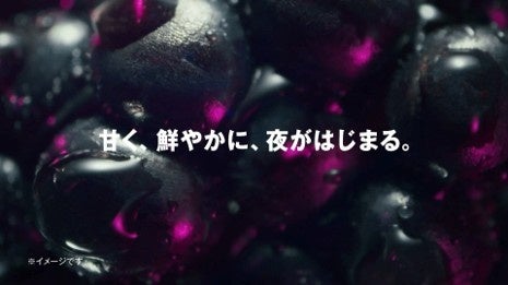 宝石のルビーを想起させる色合いとファッションショーのランウェイを彷彿させるシーンの中で、大胆に歩き続けるモデルとともに「ブラックルビー」が登場します。また「ブラックルビー」の甘さやフルーティーさのイメージとしてブラックベリーを使用することで、心躍る夜のはじまりが「ブラックルビー」とともにはじまることを「甘く、鮮やかに、夜がはじまる。」のメッセージとともに表現しています。
